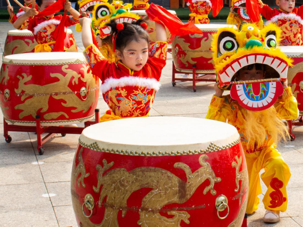 91论坛 爱心幼儿园的孩子们表演打鼓、舞狮 (朱泽雅 摄)