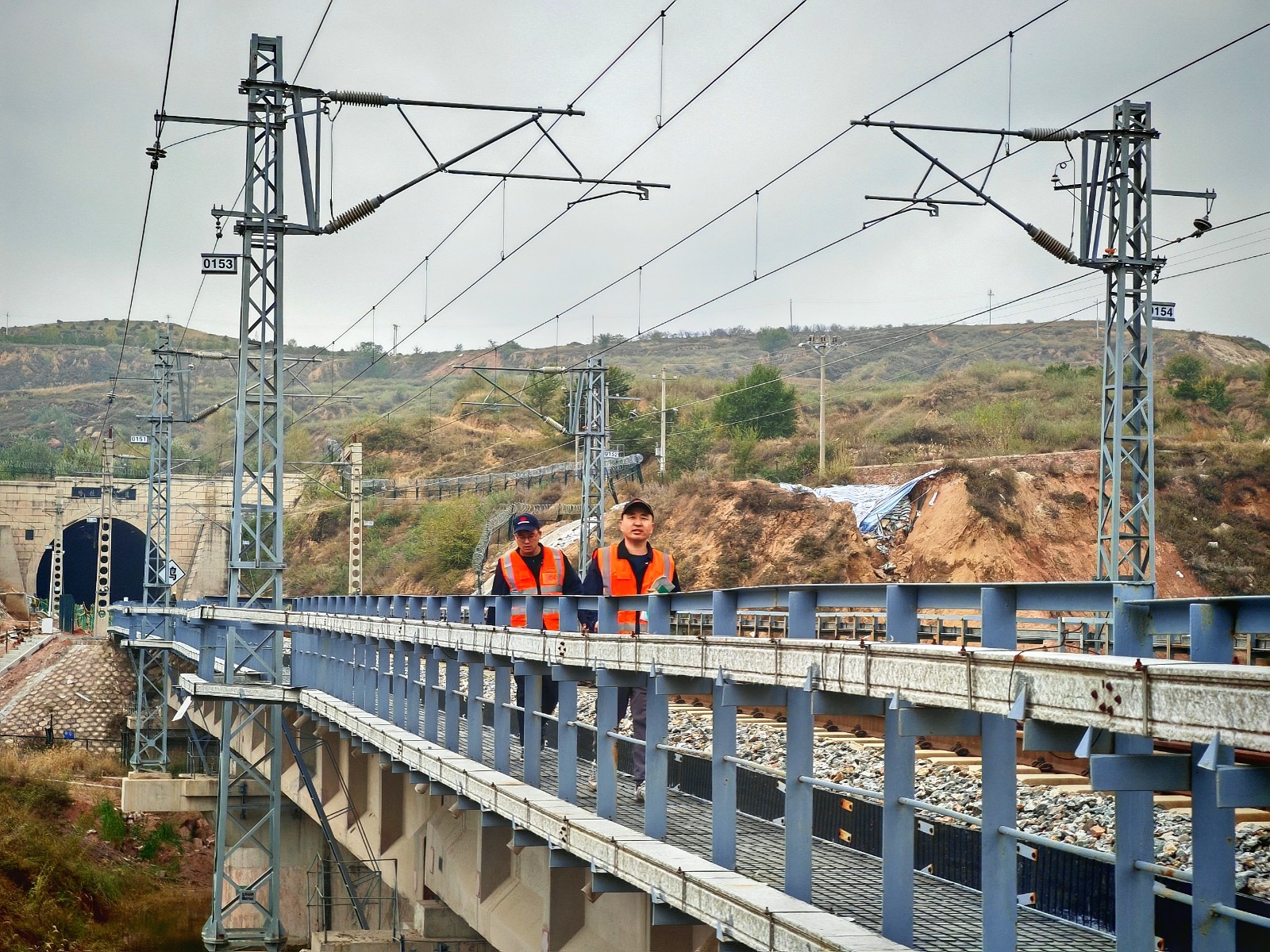 图为应急小组人员徒步通过隧道后在铁路桥上排查应急线路