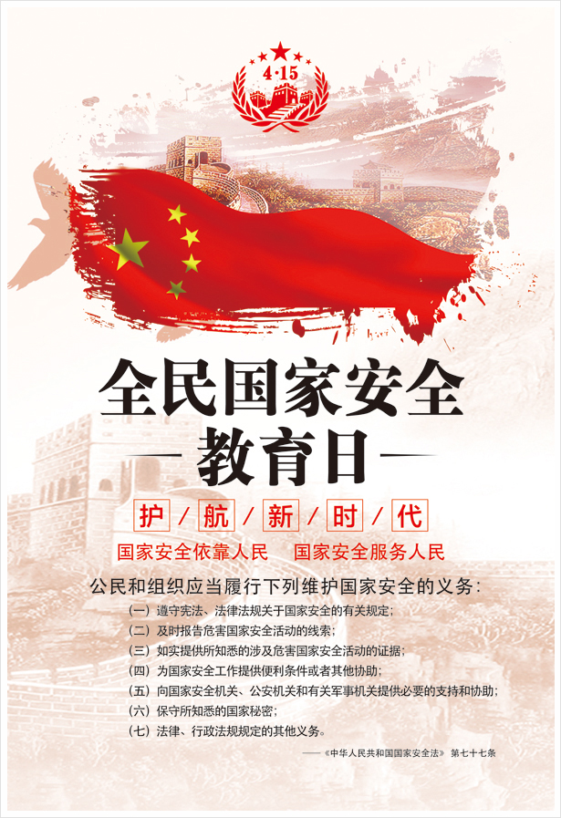 今年4月15日,是党的十九大后第一个全民国家安全教育日。深入开展国家安全宣传教育,切实增强全体干部职工国家安全意识,是集团公司贯彻落实新形势下国家安全工作部署的重要任务,是建设具有全球竞争力的世界一流能源集团的重要保障。为进一步普及国家安全知识,集团网站特制作专题,希望全体干部职工认真学习,进一步增强国家安全意识,依法履行维护国家安全的职责和义务,筑牢国家安全“钢铁长城”。